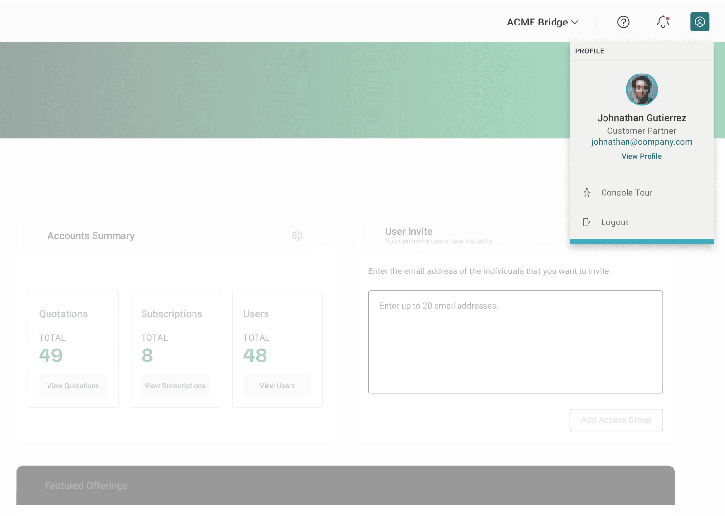 Allows users to change the context of their view, displaying account-specific data and settings.